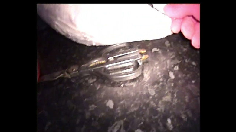 The man takes out a strange bag out of his shed.