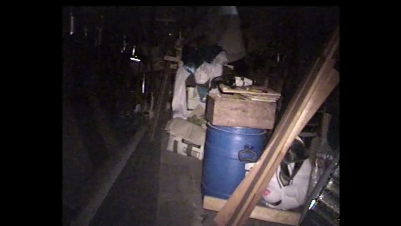 A mysterious figure prepares a creepy costume in an old shed.